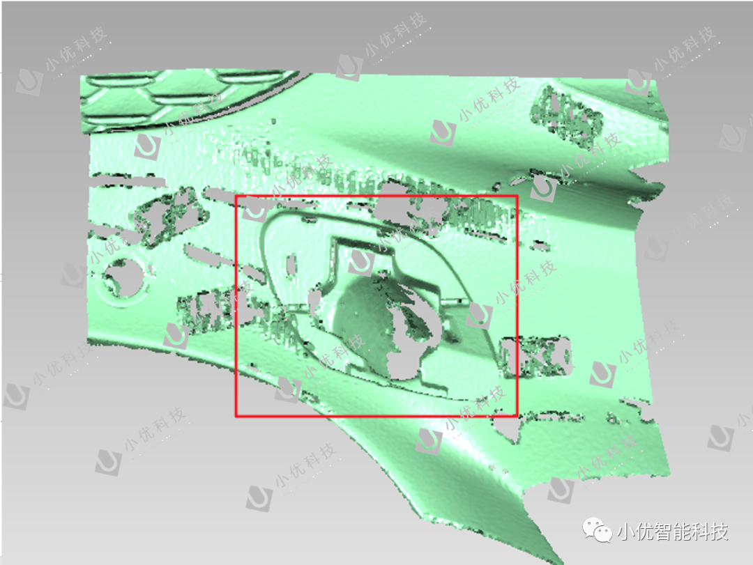 3D視覺選取如下圖一所示的保險(xiǎn)杠上的拖車蓋位置(圖二紅框處),或其他共兩個(gè)特征的坐標(biāo)給機(jī)器人(此兩點(diǎn)作為基準(zhǔn)點(diǎn)),3D視覺根據(jù)兩個(gè)基準(zhǔn)的位置變化計(jì)算機(jī)器人所要走的正確位置,機(jī)器人按照發(fā)送的點(diǎn)位走軌跡,保證每次視覺的位置偏差在±0.5mm內(nèi)。